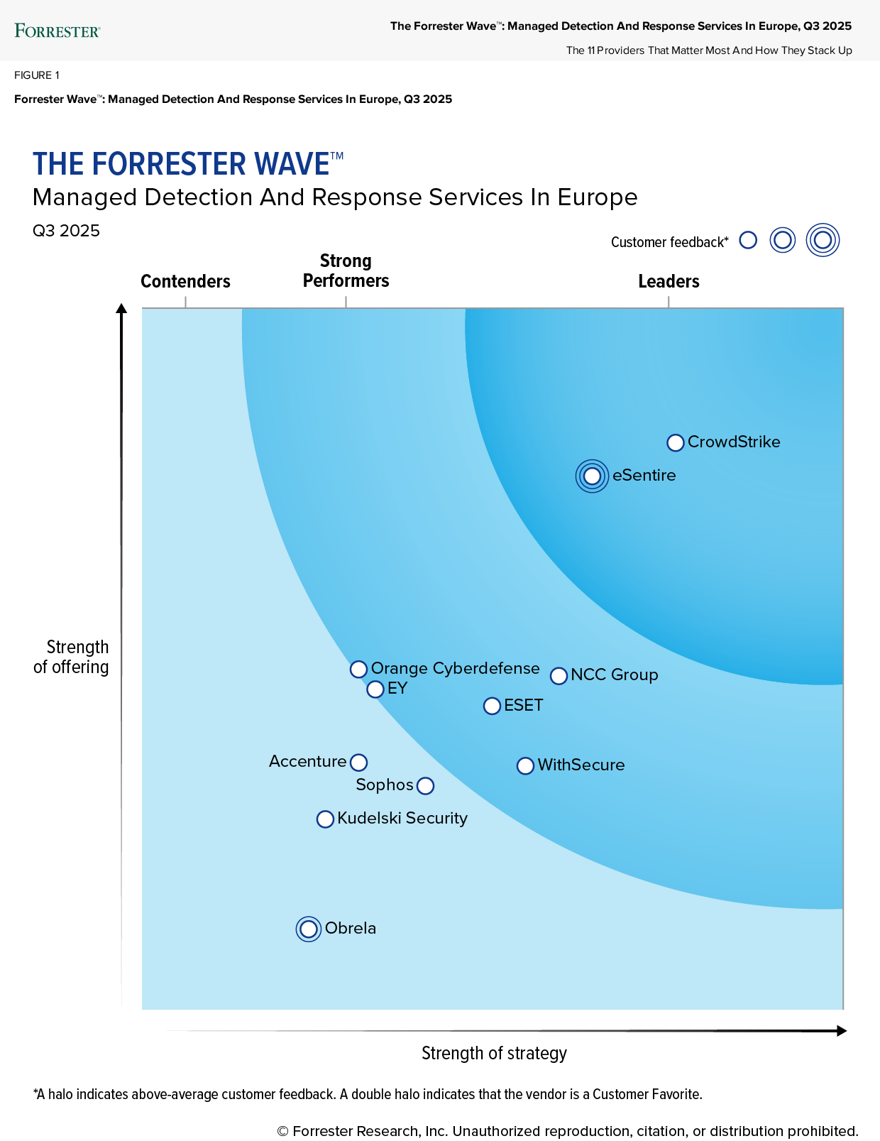 CrowdStrike has once again proven its leadership in cybersecurity, being named a Leader in The Forrester Wave™: Managed Detection and Response (MDR) Services in Europe, Q3 2025. In this evaluation, CrowdStrike received the highest possible scores in 16 criteria, including endpoint detection surface, identity detection surface, cloud detection surface, managed response (manual and automated), threat hunting, analyst experience, vision, and innovation